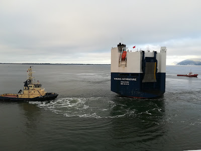 Na foto, o navio "VIKING ADVENTURE" em manobra de atracação no cais Ro-Ro. Atracados, encontram-se os navios "PERLE" no terminal da Sadopor e o navio "PATARA", no terminal Ro-Ro.